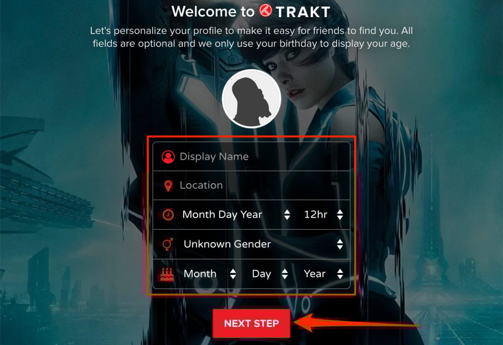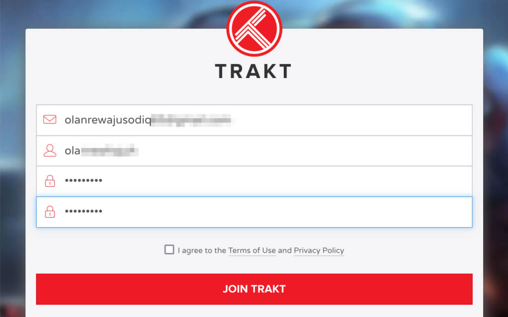 Παρέχετε τις πληροφορίες (email, όνομα χρήστη, κωδικός πρόσβασης κ.λπ.) που απαιτείται για τη δημιουργία ενός λογαριασμού trakt και προχωρήστε στο επόμενο βήμα.
