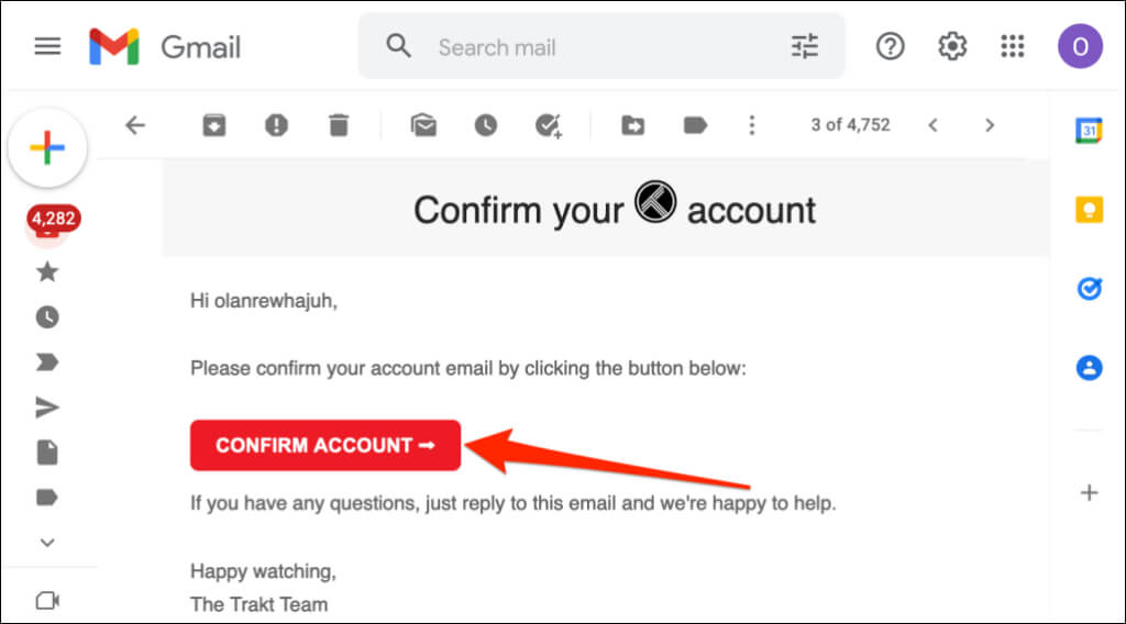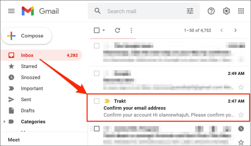 - Το Trakt θα στείλει ένα μήνυμα επαλήθευσης στη διεύθυνση email σας. Ανοίξτε τα εισερχόμενά σας (ή φάκελο ανεπιθύμητης αλληλογραφίας) και ανοίξτε το μήνυμα ηλεκτρονικού ταχυδρομείου από το Trakt με θέμα "Επιβεβαίωση της διεύθυνσης email σας".