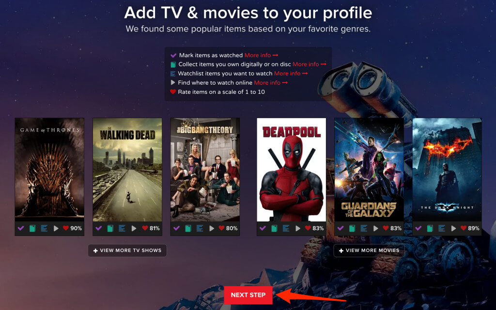- Επιλέξτε ταινίες/εμφανίσεις που έχετε παρακολουθήσει και τα αντικείμενα που έχετε στην κατοχή σας - ειδικά ή στο δίσκο. Μπορείτε επίσης να προσθέσετε περιεχόμενο στη λίστα παρακολούθησης (δηλαδή, δείχνει ότι θέλετε να παρακολουθήσετε). ΕπιλέγωΕπόμενο βήμανα συνεχιστεί.