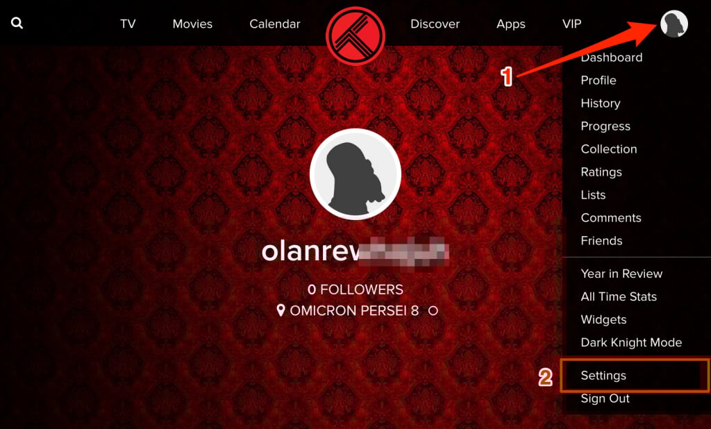 - Συνδεθείτε στον λογαριασμό σας trakt σε ένα πρόγραμμα περιήγησης ιστού, πατήστε το δικό σαςεικονίδιο προφίλ, και επιλέξτεΡυθμίσεις.