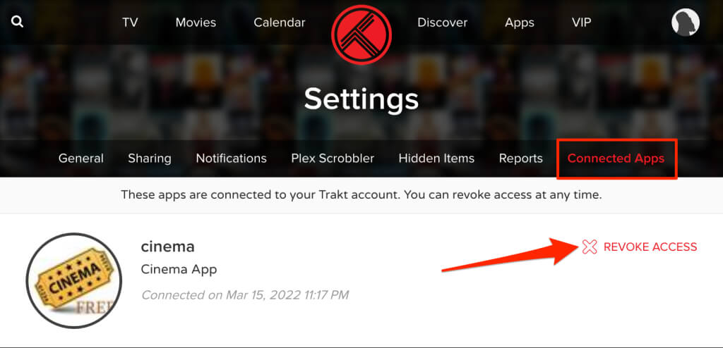 - Κατευθυνθείτε προς τοΣυνδεδεμένες εφαρμογέςΤμήμα για να δείτε όλες τις εφαρμογές που έχουν εξουσιοδοτηθεί να αποκτήσετε πρόσβαση στον λογαριασμό σας trakt.