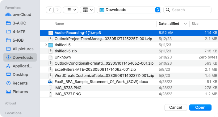 - Στο αναδυόμενο παράθυρο εισαγωγής ήχου, χρησιμοποιήστε είτε τοΗ κίνηση μουήΠρόσφατοςκαρτέλα για να εντοπίσετε το αρχείο ήχου.