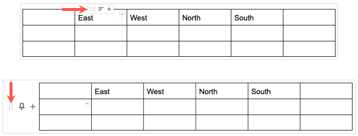 Τοποθετήστε το δείκτη του δρομέα σας πάνω από μια στήλη ή μια σειρά για να εμφανίσετε τη μικρή γραμμή εργαλείων. Επιλέξτε τοπλέγμαεικονίδιο στην αριστερή πλευρά της γραμμής εργαλείων και στη συνέχεια σύρετε τη στήλη αριστερά ή δεξιά ή τη σειρά προς τα πάνω ή προς τα κάτω.