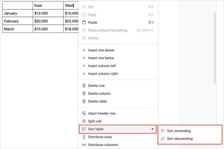 Μπορείτε επίσης να κάνετε δεξί κλικ στη στήλη, να μεταβείτε στοΤραπέζι ταξινόμησης, και διαλέξτεΤαξινόμησηήΤαξινόμηση φθίνουσαςΣτο μενού pop-out.