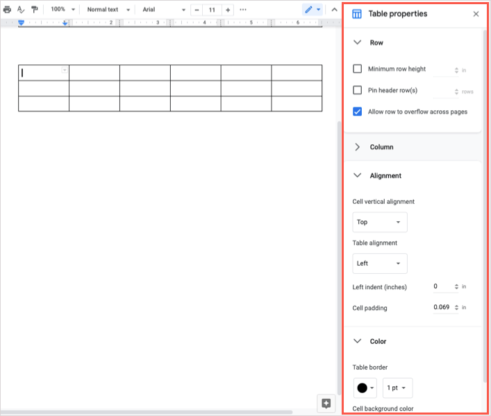 Μπορεί να θέλετε να κάνετε κάποιες αλλαγές στην εμφάνιση του πίνακα σας πριν προσθέσετε δεδομένα σε αυτό ή μετά. Μπορείτε να ρυθμίσετε τις ιδιότητες σειράς, στήλης, ευθυγράμμισης και χρωμάτων για έναν πίνακα Docs Google.