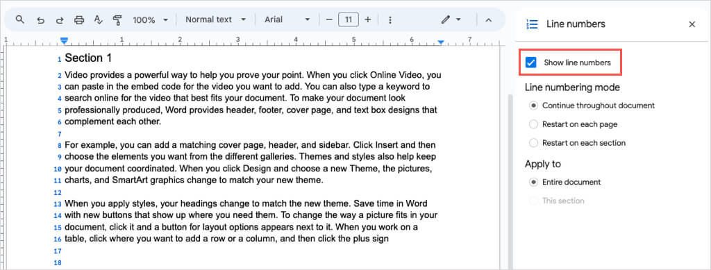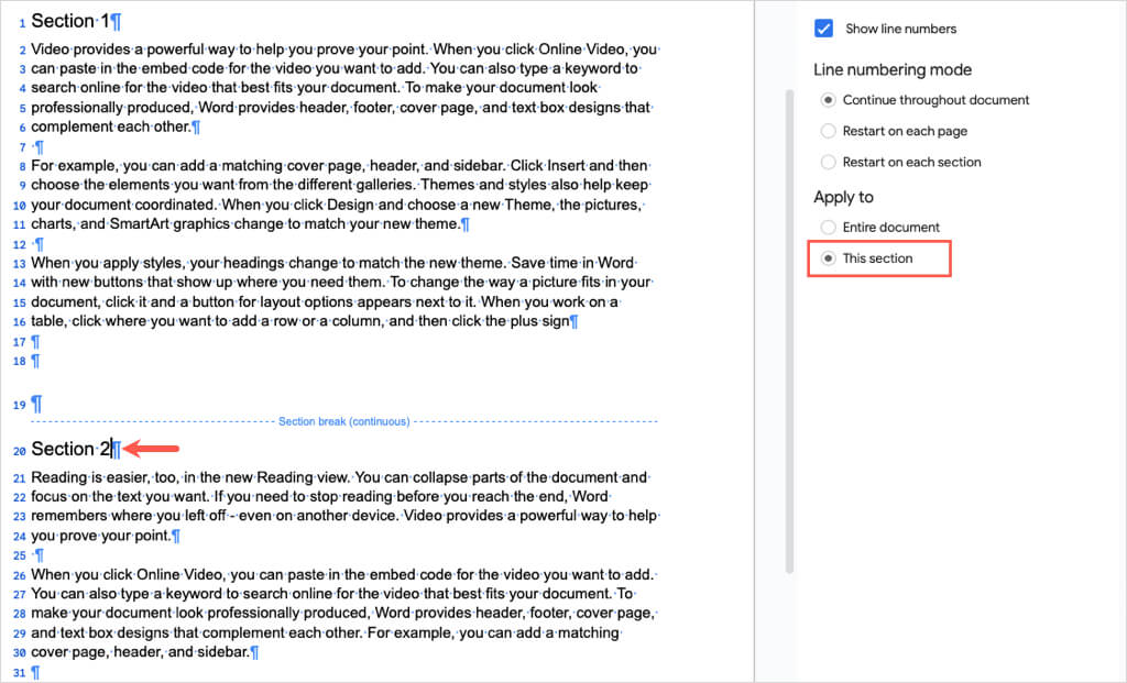 Μπορείτε να ακολουθήσετε αυτά τα ίδια βήματα για να αριθμήσετε άλλα τμήματα στο έγγραφό σας με τον ίδιο τρόπο. Στη συνέχεια, ανατρέξτε στη γραμμή που χρειάζεστε καθορίζοντας την ενότητα και τον αριθμό γραμμής μέσα σε αυτήν.