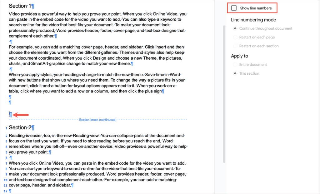 Εάν έχετε ένα έγγραφο όπου θέλετε μόνο να αριθμήσετε γραμμές σε ορισμένα τμήματα και όχι σε ολόκληρο το έγγραφο, θα ξεκινήσετε προσθέτοντας αυτά τα τμήματα.