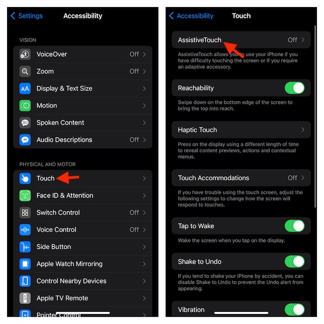 - Πηγαίνετε στοΕφαρμογή ρυθμίσεων στο iPhone σας -> Προσβασιμότητα -> Αγγίξτε -> Assistivetouch.