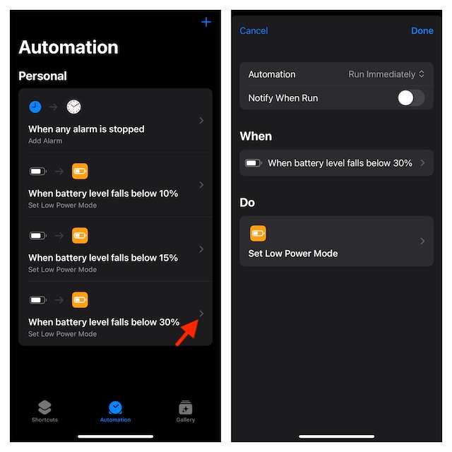 - Μεταβείτε στην εφαρμογή συντομεύσεων στο iPhone -> Automation Tab -> Πατήστε στο μικροσκοπικό βέλος προς τα εμπρός δίπλα στον εν λόγω αυτοματισμό.