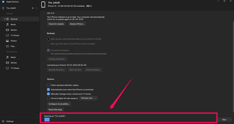 9.Ο χρόνος ολοκλήρωσης της διαδικασίας δημιουργίας αντιγράφων ασφαλείας θαεξαρτάται από το μέγεθος του τοπικού αντιγράφου ασφαλείας. Έτσι, εάν έχετε ένα μεγάλο ποσό δεδομένων που είναι αποθηκευμένα στο iPhone σας, θα μπορούσε να χρειαστεί μια ώρα για την εφαρμογή Apple Devices για να δημιουργήσετε ένα τοπικό αντίγραφο ασφαλείας στο Windows 11 PC ή στο φορητό υπολογιστή σας.