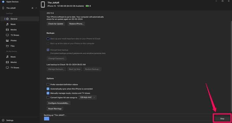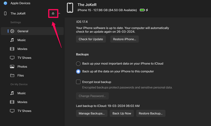 11.Μόλις ολοκληρωθεί η διαδικασία δημιουργίας αντιγράφων ασφαλείας, μπορείτεΕξαγάγετε το iPhone σαςστην εφαρμογή Apple Devices καιΑποσυνδέστε το από τον υπολογιστή σαςή φορητό υπολογιστή.