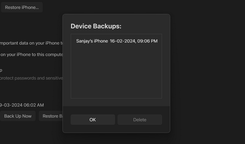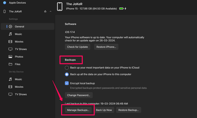 Τώρα, εκτός από τη δημιουργία τοπικών αντιγράφων ασφαλείας iPhone των δεδομένων iPhone στο Windows 11 PC ή στο φορητό υπολογιστή σας, μπορείτε επίσης να διαγράψετε τα υπάρχοντα αντίγραφα ασφαλείας χρησιμοποιώντας την εφαρμογή Apple Devices. Δείτε τα παρακάτω βήματα για να μάθετε πώς: