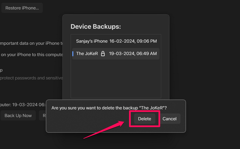 7.Μόλις επιβεβαιώσετε τη διαγραφή,Το επιλεγμένο αντίγραφο ασφαλείας iPhone θα διαγραφεί αμέσωςαπό τη συσκευή των Windows 11.