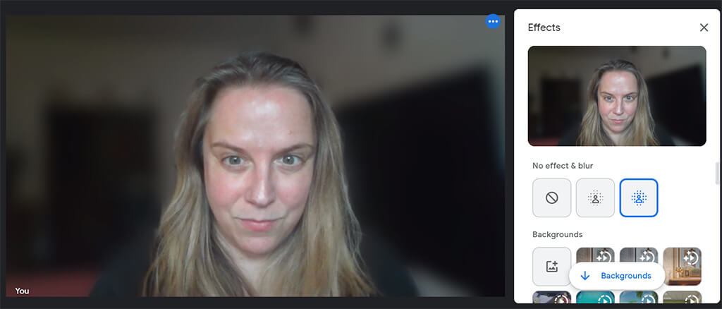 Όπως και οι ομάδες Zoom και Microsoft, η εφαρμογή Google Meet Video Conferencing έρχεται με εικονικό φόντο και εφέ φόντου - συμπεριλαμβανομένου ενός χαρακτηριστικού θολώματος - ότι μπορείτε να εφαρμόσετε για να σκοτώσετε ό, τι είναι φυσικά πίσω σας.