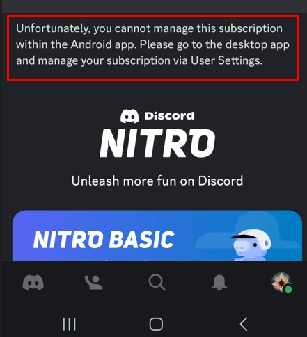 Το Discord χρησιμοποιείται για να σας επιτρέψει να ακυρώσετε συνδρομές από κινητές συσκευές, αλλά αυτό δεν συμβαίνει πλέον. Προκειμένου να διαχειριστείτε τα σχέδια συνδρομής, πρέπει να χρησιμοποιήσετε μια εφαρμογή επιφάνειας εργασίας ή ιστού. Δεν είναι γνωστό εάν και πότε η λειτουργία ακύρωσης θα επιστρέψει στις εφαρμογές για κινητά. Προς το παρόν, η εφαρμογή τηλεφώνου εμφανίζει ένα μήνυμα που σας λέει να μεταβείτε στις ρυθμίσεις χρήστη στην εφαρμογή Desktop για να διαχειριστείτε τη συνδρομή.