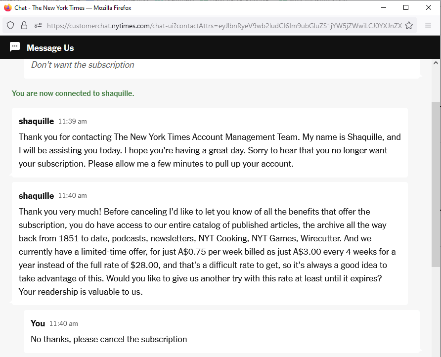 Οι συνδρομητές του δεύτερου τρόπου μπορούν να ακυρώσουν τη συνδρομή τους είναι να χρησιμοποιήσουν το κουμπί συνομιλίας της ιστοσελίδας της NY Times. Αυτός είναι ο ευκολότερος τρόπος για να διαγραφεί από τις περισσότερες συσκευές, συμπεριλαμβανομένου του υπολογιστή σας, του τηλεφώνου Android ή του iPhone. Δυστυχώς, η εφαρμογή New York Times θα σας στείλει μέσα από τα ίδια στεφάνια.