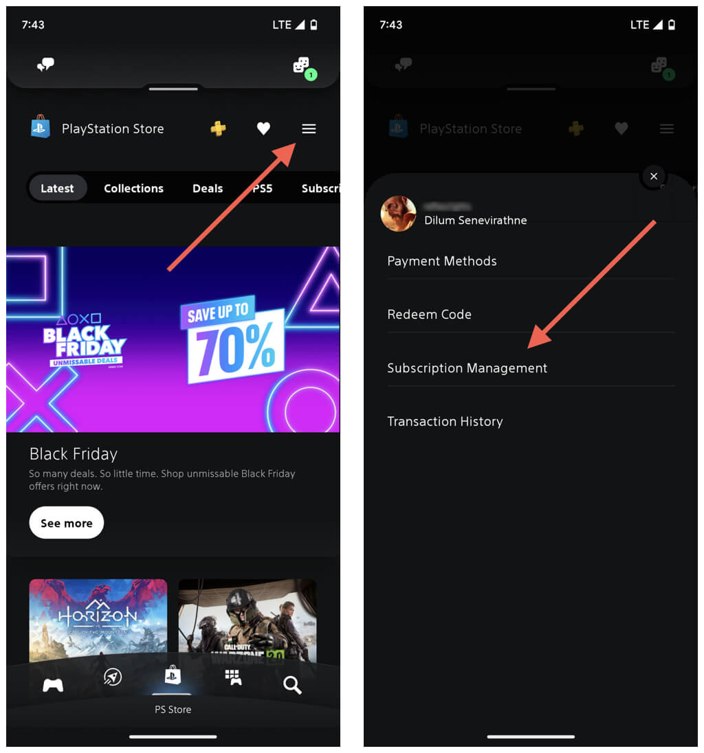 Εάν έχετε ρυθμίσει την εφαρμογή PS στο Android ή το iPhone σας, μπορείτε να το χρησιμοποιήσετε για να ακυρώσετε τη συνδρομή PlayStation Plus. Μεταβείτε στοΚατάστημα PlayStationκαρτέλα, πατήστε τοΜενούεικονίδιο (τρεις στοιβαγμένες γραμμές) και επιλέξτεΔιαχείριση συνδρομών.