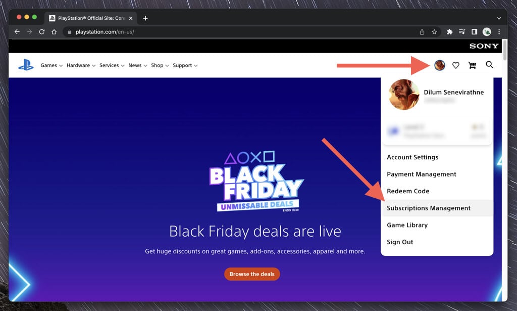Απλά συνδεθείτε στοPlaystation.comμε τα διαπιστευτήριά σας PSN. Εάν ο λογαριασμός απαιτεί έλεγχο ταυτότητας δύο παραγόντων, πρέπει να επαληθεύσετε ότι είστε εσείς εισάγοντας τον κωδικό που λαμβάνετε στο τηλέφωνό σας. Στη συνέχεια, επιλέξτε το πορτρέτο του προφίλ σας στην επάνω αριστερή γωνία της οθόνης και επιλέξτεΔιαχείριση συνδρομών.