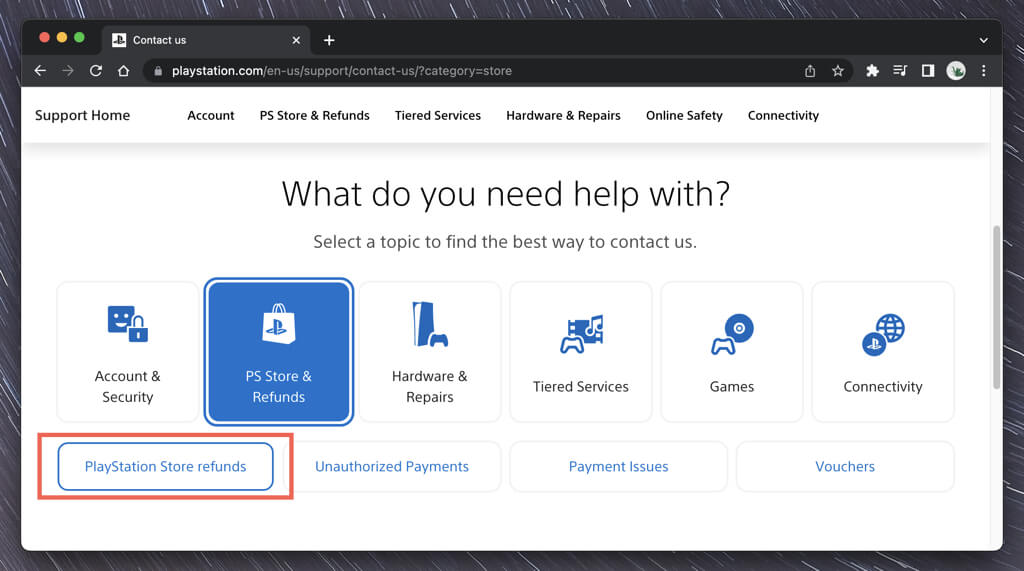 Για να το κάνετε αυτό, επισκεφθείτε τοPlayStation Επικοινωνία Σελίδα υποστήριξηςΜέσω ενός προγράμματος περιήγησης ιστού σε επιφάνεια εργασίας ή κινητή συσκευή και συνδεθείτε με τα διαπιστευτήρια λογαριασμού δικτύου PlayStation. Στη συνέχεια, επιλέξτεPS Store & Rescunds>Κατάστημα PlayStation επιστρέφει.