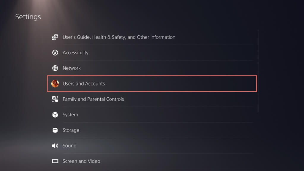 - Μετακινηθείτε προς τα κάτω το μενού Ρυθμίσεις και εισαγάγετε τοΧρήστες και λογαριασμούς(PS5) ήΔιαχείριση λογαριασμού(PS4) κατηγορία.