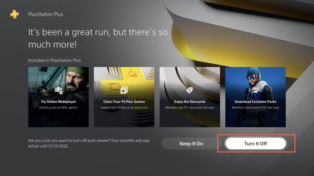 - Μπορείτε να ακυρώσετε μόνο την αυτόματη ανανέωση, πράγμα που σημαίνει ότι θα λάβετε όλα τα οφέλη PS Plus μέχρι το τέλος της τρέχουσας περιόδου συνδρομής. Για παράδειγμα, εάν είστε εννέα μήνες σε ετήσια συνδρομή, θα συνεχίσετε να έχετε πρόσβαση σε αυτό για τρεις μήνες περισσότερο. Μπορείτε να επεκτείνετε τη διάρκεια με χειροκίνητες πληρωμές εάν θέλετε.