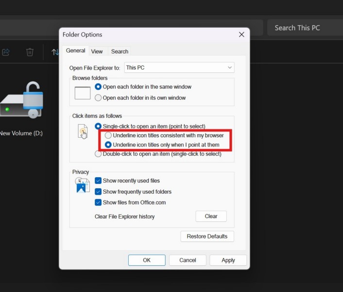 6.Τώρα, κάτω από το κλικ για να ανοίξετε ένα στοιχείο (σημείο προς επιλογή) ρύθμιση, υπάρχουν δύο υπο-ρύθμιση-Υπογραμμίστε τους τίτλους εικονιδίων σύμφωνα με το πρόγραμμα περιήγησής μουκαιΥπογραμμίστε τους τίτλους εικονιδίων μόνο όταν τους δείχνω. Από προεπιλογή,Η δεύτερη επιλογή θα επιλεγεί.