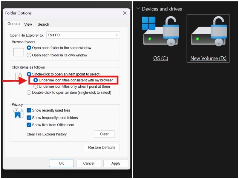 Εάν θέλετε το Windows 11 PC ή το φορητό υπολογιστή σας για να ανοίξετε αρχεία και φακέλους με ένα μόνο κλικ του ποντικιού, μπορείτε να μεταβείτε από το διπλό κλικ για να ανοίξετε μια ρύθμιση στοιχείου στο ενιαίο κλικ για να ανοίξετε μια ρύθμιση στοιχείου στο παράθυρο επιλογών φακέλου. Αυτή η αλλαγή θα σας επιτρέψει να ανοίξετε ένα αρχείο ή ένα φάκελο με ένα μόνο κλικ στο κουμπί του αριστερού ποντικιού.