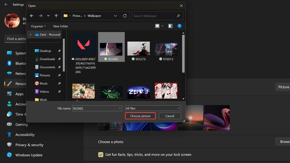 - Επιλέξτε την εικόνα που θα χρησιμοποιηθεί ως φόντο στην οθόνη κλειδώματος των Windows 11> Κάντε κλικ στοΕπιλέξτε εικόνακουμπί.