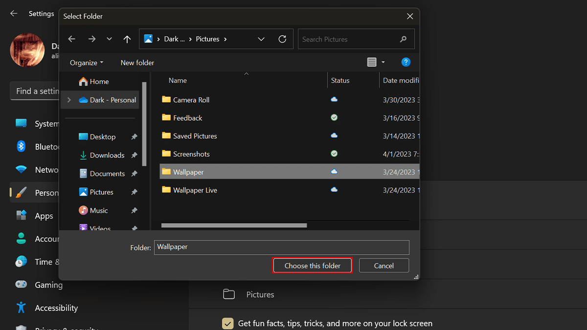 - Επιλέξτε το φάκελο με τις εικόνες για να περιστρέψετε στην οθόνη κλειδώματος> Κάντε κλικ στοΕπιλέξτε αυτόν τον φάκελοκουμπί.