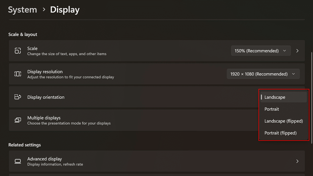 - Στην ενότητα "Scale & Layout", επιλέξτε τον προσανατολισμό της οθόνης με τη ρύθμιση "Προσανατολισμός οθόνης":