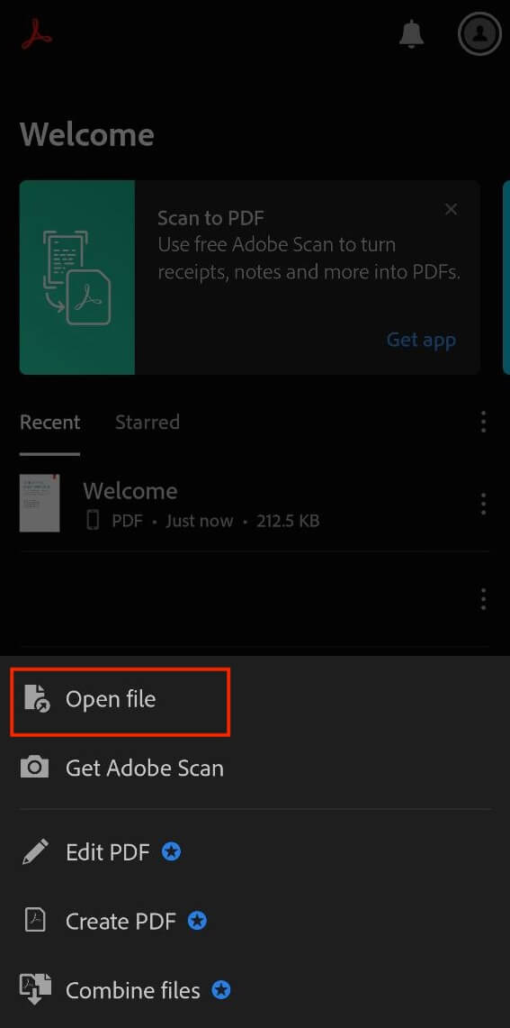 Στο Adobe Acrobat Reader, επιλέξτεΑνοιχτό αρχείοΓια να προσθέσετε το αρχείο PDF που θέλετε να επεξεργαστείτε στο Acrobat Reader στο τηλέφωνό σας. Μπορείτε να εισαγάγετε το αρχείο από το smartphone σας και να αφήσετε την εφαρμογή να το εντοπίσει αυτόματα.