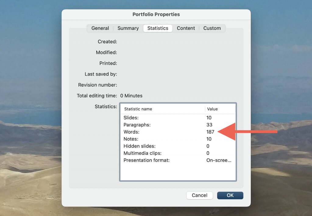 - ΕπιλέγωΕμφάνιση όλων των ιδιοτήτων(Παράθυρα) ήΣτατιστική(macOS). Θα πρέπει να δείτε τον αριθμό των λέξεων της παρουσίασης δίπλαΛόγια.