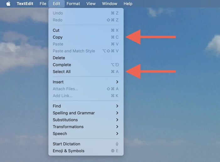 - ΤύποςCtrl+ΕΝΑ(PC) ήCMD+ΕΝΑ(MAC) για να επισημάνετε όλο το κείμενο μέσα στο αρχείο, και στη συνέχειαCtrl+ντο(PC) ήCMD+ντο(MAC) Αντιγράψτε το επιλεγμένο κείμενο στο πρόχειρο. Μπορείτε επίσης να χρησιμοποιήσετε τοΕπιλέξτε όλακαιΑντίγραφοΕπιλογές στοΕκδίδωμενού εάν δεν προτιμάτε τις συντομεύσεις πληκτρολογίου.