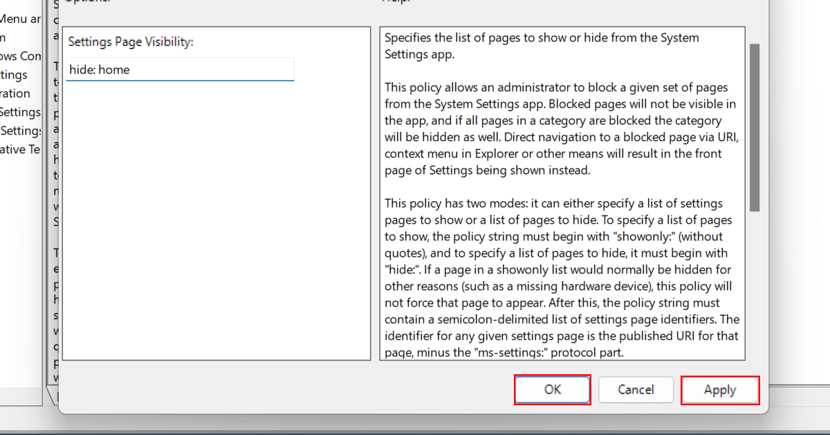 - Επιλέξτε τοΕνεργοποιημένοςεπιλογή και αλλάξτε το "Ορατότητα ρυθμίσεων«Ρύθμιση της τιμής σεΑπόκρυψη: σπίτι.