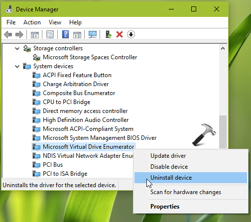 Σημείωμα:Σε παρακάτω βήματα, υποτίθεται ότι τα Windows είναι εγκατεστημένα στο C:. Σε αυτόπαράδειγμα, έχουμε δείξει βήματα αφαιρώντας τον απαριθμητικό εικονικού δίσκου της Microsoft. Μπορείτε να εφαρμόσετε παρόμοια βήματα στο πρόγραμμα οδήγησης που θέλετε να απεγκαταστήσετε.