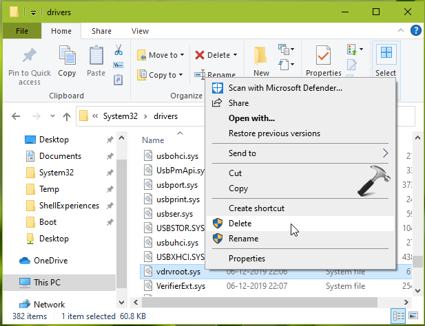 6.Όπως και στο βήμα 3, πήραμε την πραγματική θέση του αρχείου οδηγού. Έτσι πηγαίνουμεC:WindowsSystem32driversΦάκελος και βρήκε τον οδηγό. Μπορείτε απλά να κάνετε δεξί κλικ στο πρόγραμμα οδήγησης και να επιλέξετεΔιαγράφω. Εάν σας ζητηθείΔικαιώματα UAC, παρέχει τους για να ολοκληρώσουν τη λειτουργία.