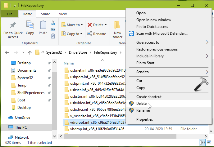 7.Στη συνέχεια, διαγράφουμε το αρχείο .inf για τη μονάδα δίσκου. Έτσι, καθώς πήραμε το όνομα INF στο βήμα 2, χρησιμοποιήστε αυτό ως Intials και με τη βοήθεια αυτού, εντοπίστε το φάκελο του οδηγού InflC:WindowsSystem32DriverStoreFileRepository. Κάντε δεξί κλικ στο φάκελο για να το διαγράψετε, να δώσετε τα δικαιώματα UAC για να ολοκληρώσετε.