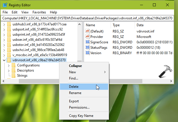 9.Χρησιμοποιώντας το INF Name Intials που πήραμε στο βήμα 2, εντοπίζουμε τον οδηγό. Μπορείτε να κάνετε κλικ στο υπο-κλειδί του οδηγού σας και να επιβεβαιώσετε το όνομά του, το αντίστοιχο δεξιό παράθυρο. Τώρα απλώς εξαγάγετε το κλειδί μητρώου οδηγού ως αντίγραφο ασφαλείας. Τότε δεξί κλικ καιΔιαγράφωΟ οδηγός. Κλείσιμο συντάκτη μητρώου.