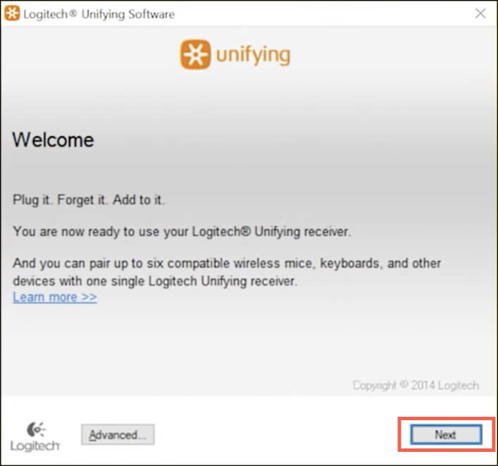- ΕπιλέγωΕπόμενοςΣτην οθόνη καλωσορίσματος λογισμικού Logitech Unifying Software.