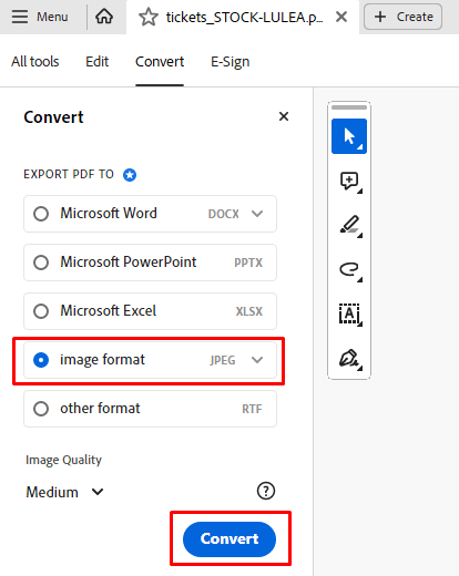 - Επιλέξτε τοΜορφή εικόναςκαι στη συνέχεια επιλέξτεJpegαπό το αναπτυσσόμενο μενού. Επιλέξτε τοΜετατρέπωκουμπί.