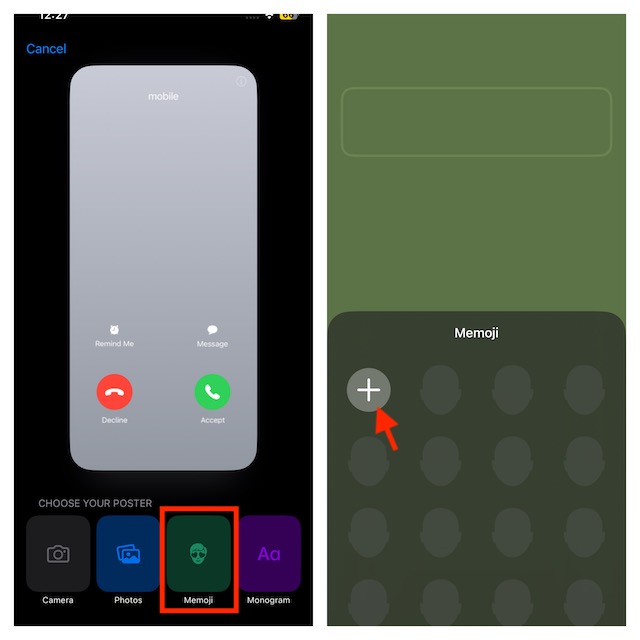 - Στη συνέχεια, μπορείτε να επιλέξετε ένα υπάρχον memoji ή να κάνετε ένα νέο. Για να το κάνετε αυτό, πατήστε στο"+"Κουμπί -> Επιλέξτε ένα πρόσωπο Memoji και προσαρμόστε το.