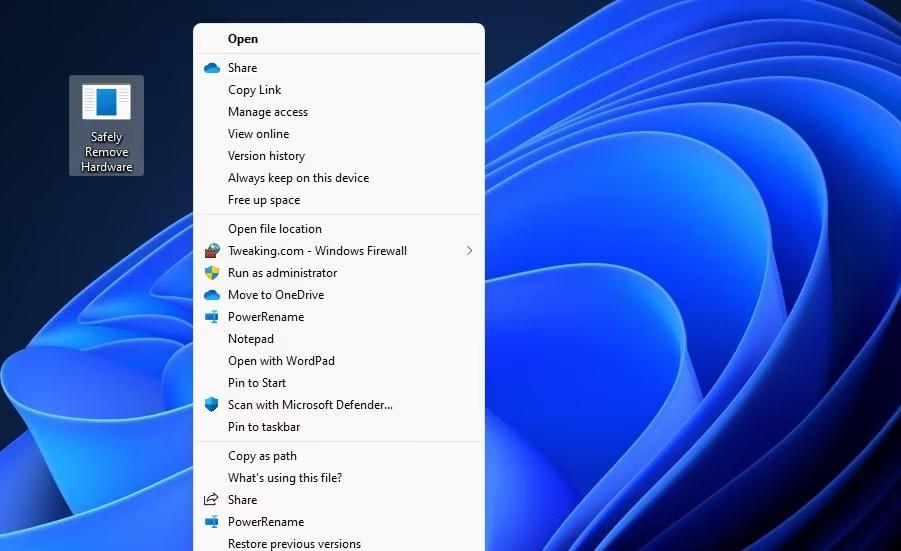 Μπορείτε τώρα να δείτε το νέο στοιχείο που προσθέσατε στο μενού περιβάλλοντος των Windows 11. Κάντε ένα δεξί κλικ σε οποιοδήποτε κενό χώρο στην επιφάνεια εργασίας σας και κάντε κλικ στην εμφάνιση περισσότερων επιλογών για να αποκαλύψετε το κλασικό μενού περιβάλλοντος. Θα βρείτε την επιλογή με ασφάλεια κατάργηση υλικού στο μενού περιβάλλοντος.