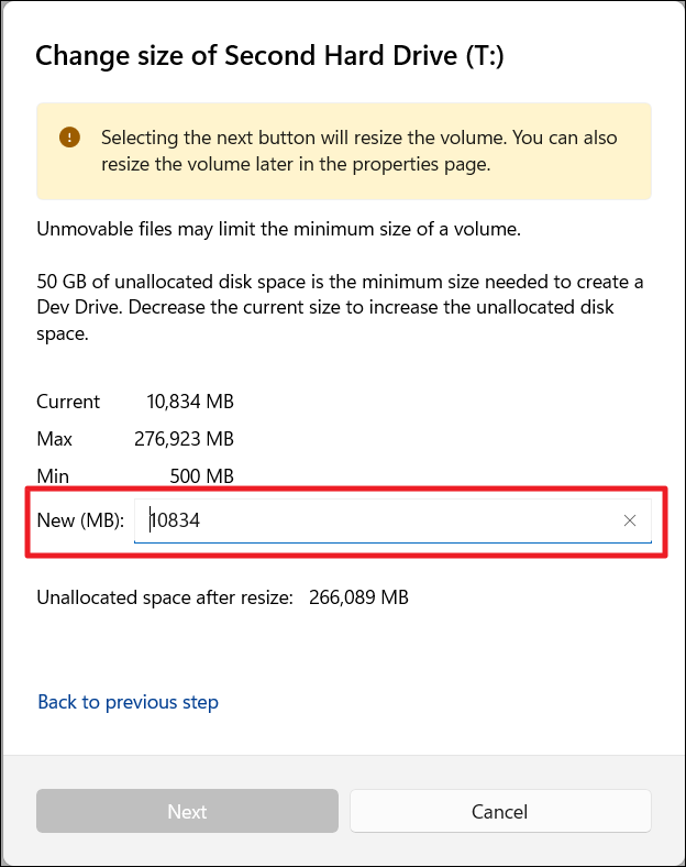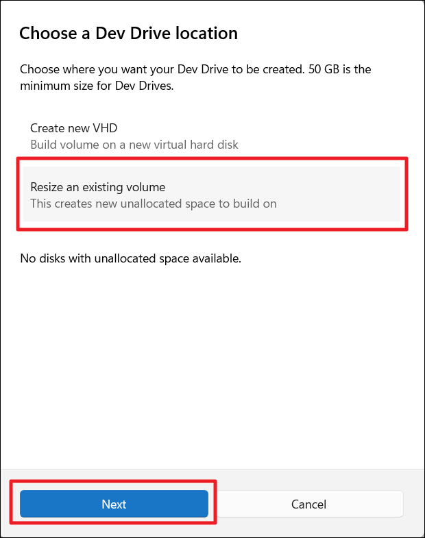 Τα Windows 11 σας επιτρέπουν επίσης να δημιουργήσετε έναν φυσικό όγκο (αντί για ένα εικονικό) στον σκληρό δίσκο με όλα τα οφέλη του Dev Drive. Ωστόσο, θα χρειαστείτε μη κατανεμημένο χώρο στον σκληρό σας δίσκο για να δημιουργήσετε μια μονάδα DEV στο φυσικό σκληρό. Εάν δεν έχετε μη κατανεμημένο χώρο, μπορείτε να χρησιμοποιήσετε την παραπάνω μέθοδο για να αλλάξετε το μέγεθος του υπάρχοντος τόμου για να απελευθερώσετε κάποιο χώρο.