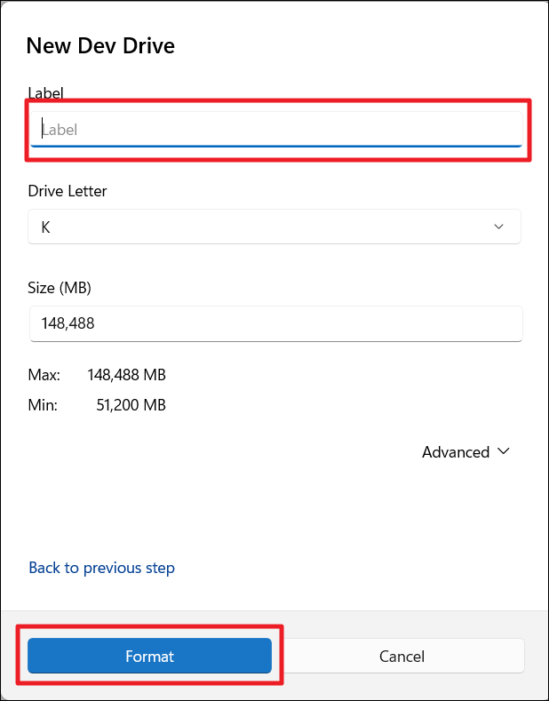 4. Κάντε κλικ στο "Δημιουργία dev drive "κουμπί.