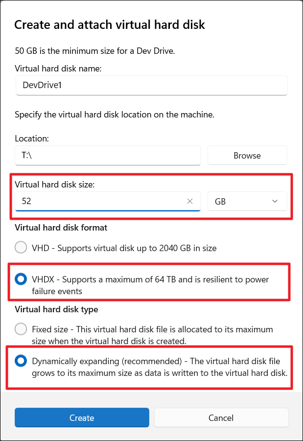 8. Επιλέξτε τη μορφή εικονικού σκληρού δίσκου ως "VHDX - υποστηρίζει το μέγιστο 64TB και είναι ανθεκτικό στα συμβάντα αποτυχίας εξουσίας"Και ρυθμίστε τον τύπο σε"Δυναμική επέκταση (συνιστάται)", Που επιτρέπει την ανάπτυξη της μονάδας δίσκου καθώς προστίθενται περισσότερα δεδομένα. Αφού κάνετε αυτές τις επιλογές, κάντε κλικ στο"Δημιουργώ". Εάν το κουμπί είναι απενεργοποιημένο, δοκιμάστε να μεταβείτε σε διαφορετική μονάδα δίσκου ως τοποθεσία.