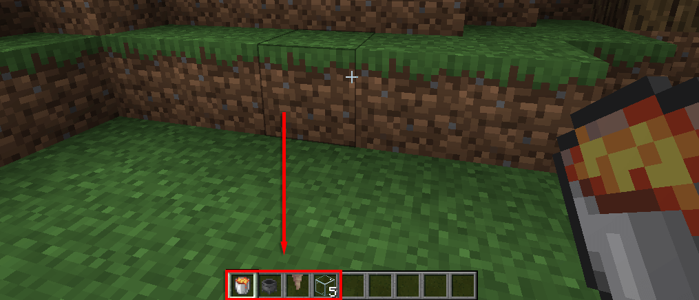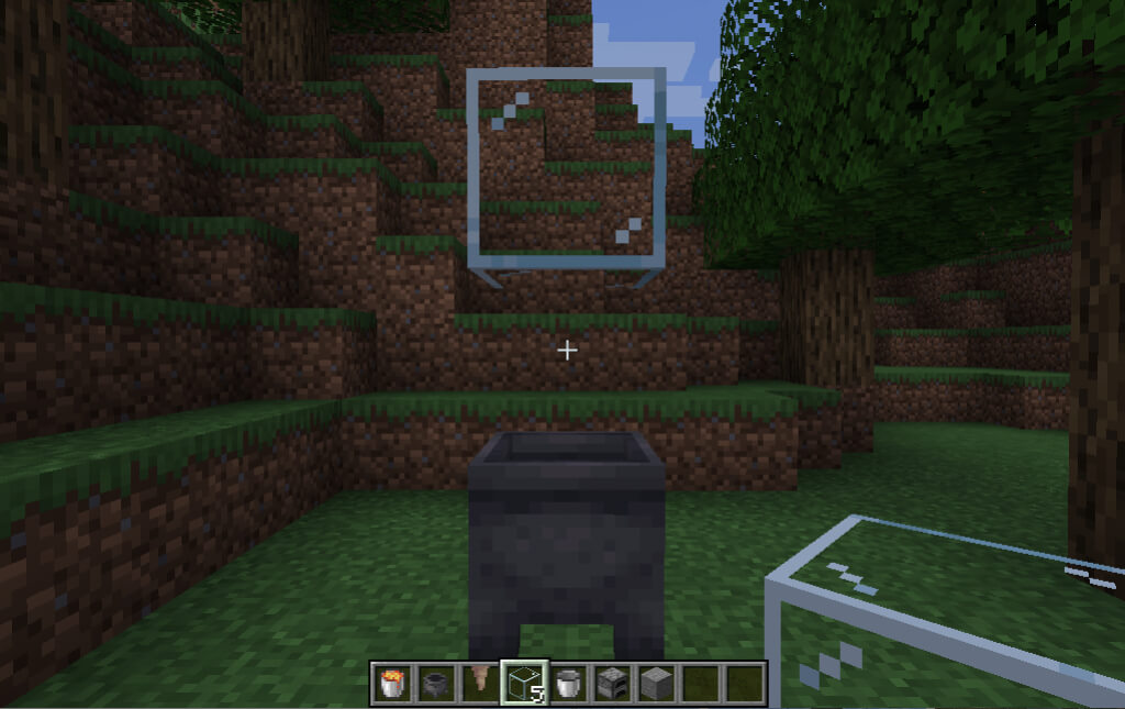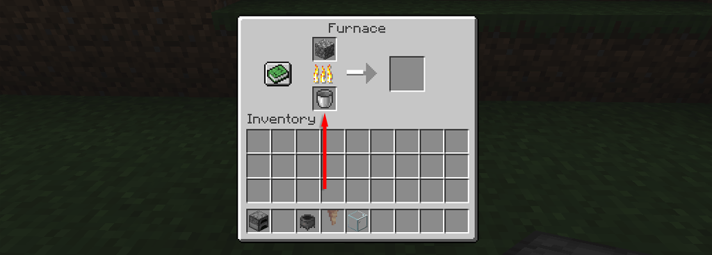 - ΕΝΑκάδος λάβα. Ένας κάδος μπορεί να δημιουργηθεί χρησιμοποιώντας τρία σιδερένια πλινθώματα σε σχήμα κουβά όπως παρακάτω. Για να συλλέξετε λάβα, απλά κρατήστε τον κάδο και κάντε δεξί κλικ σε ένα από τα μπλοκ πηγής σε μια πισίνα λάβα.