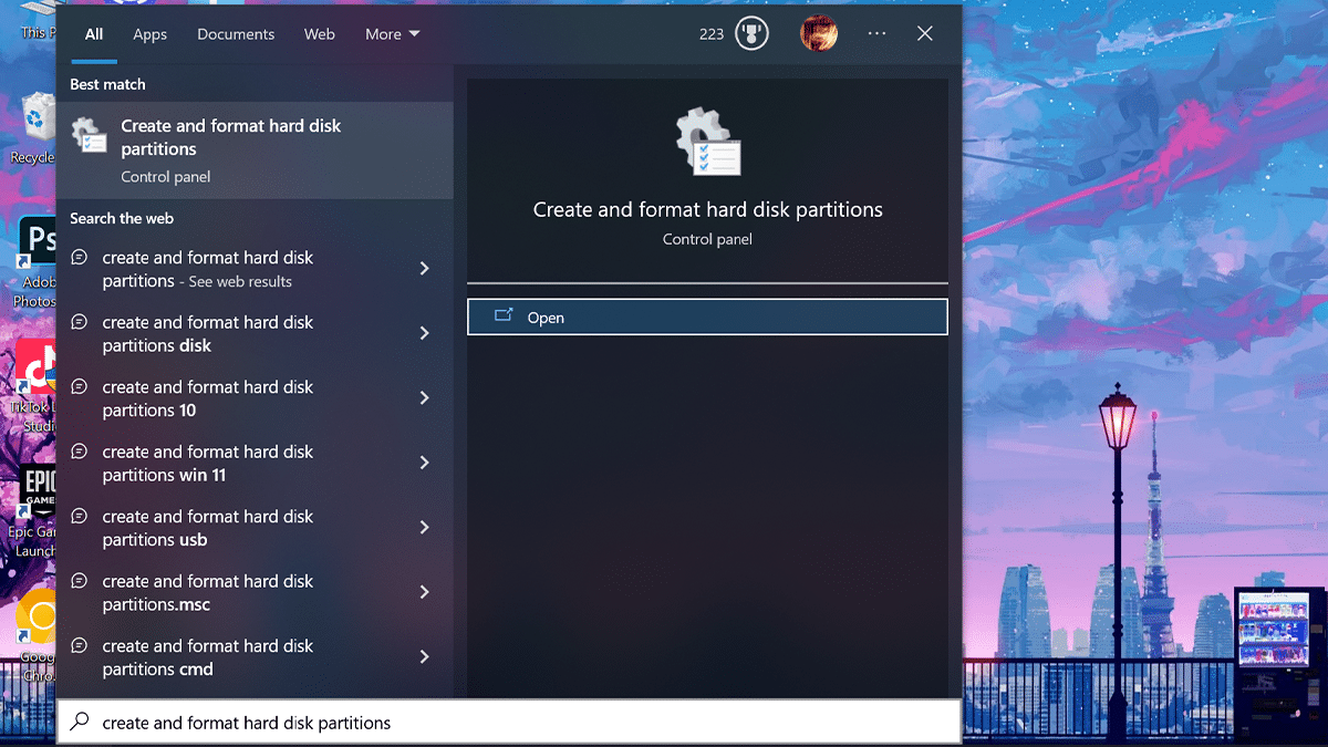 - Για να ανοίξετε τοΔιαχείριση δίσκωνapp, ανοίξτεΑρχή> αναζήτηση γιαΔημιουργία και μορφή διαμερισμάτων σκληρού δίσκου> Κάντε κλικ στοΑνοιχτόκουμπί.