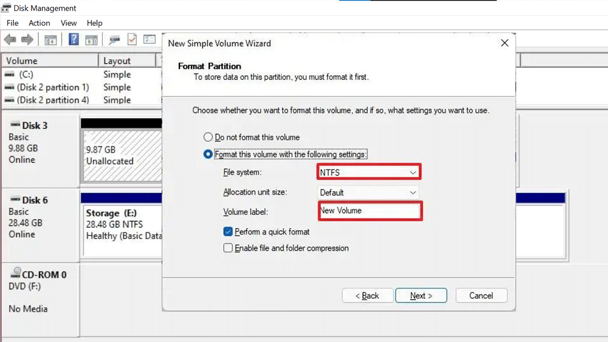 - Κάντε κλικ στοΕπόμενοςκουμπί> Επιλέξτε το "Μορφοποιήστε αυτόν τον τόμο με τις ακόλουθες ρυθμίσεις"Επιλογή> Επιλέξτε τοNTFSεπιλογή στο ""Σύστημα αρχείων"Ρύθμιση.