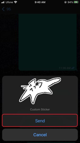 - Μόλις αφήσετε το θέμα στη συνομιλία WhatsApp, θα εμφανιστεί μια προτροπή, ρωτώντας αν θέλετε να μετατρέψετε αυτή τη φωτογραφία σε αυτοκόλλητο. Επιβεβαιώστε επιλέγονταςΣτέλνωήΔημιουργία αυτοκόλλητου.