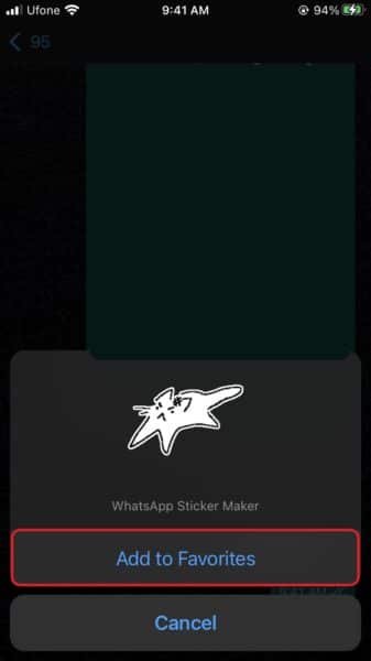 - Μετά την επιβεβαίωση, το αυτοκόλλητο θα δημιουργηθεί και θα σταλεί στη συζήτηση. Για να αποθηκεύσετε το αυτοκόλλητο στη συλλογή σας, απλά πατήστε σε αυτό και επιλέξτεΠροσθήκη στα αγαπημένα.